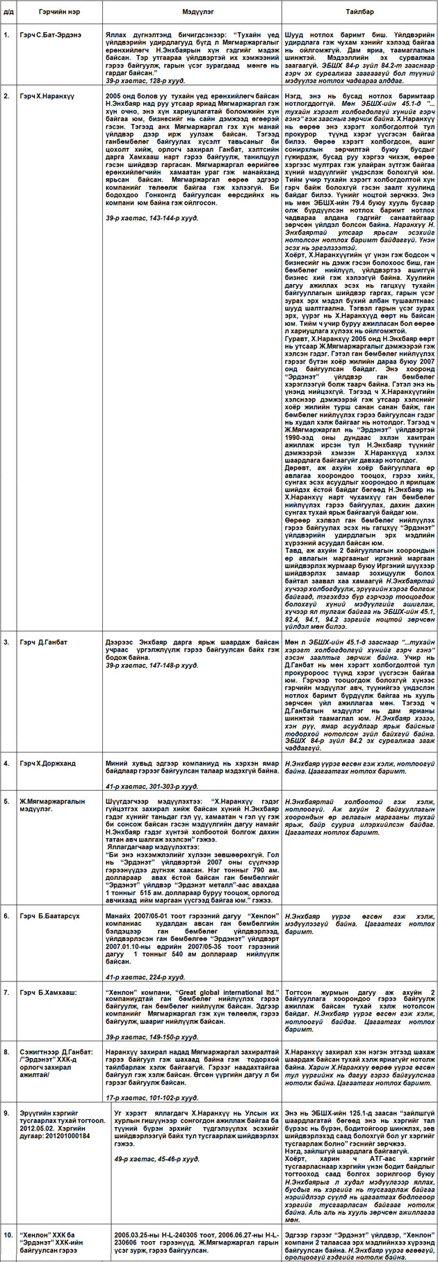 Дээр хүснэгтлэн харуулсан баримтуудаар Н.Энхбаяр нь дээрх асуудлуудтай ямар ч холбоогүй, тэдгээрийн талаар тусад нь болон хамтад нь хэзээ нэгэн цагт ямар ч шийдвэр гаргаж байгаагүй, ямар ч хууль зөрчөөгүй, дээрх асуудлуудаар ямар нэгэн байгууллага, хувь хүн хохироогүй гэдэг нь хөдөлбөргүй нотлогдож байна.