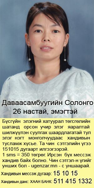 Даваасамбуу овогтой Солонго нь 1987 онд төрсөн. Дорнод аймгийн Дашбалбар сумын 10 жилийг 2004 онд төгссөн. Одоо Улаабаатар их сургуулийн оюутан боловч хүнд өвчний улмаас хичээлдээ явахгүй гэртээ асаргаанд байна. Аав, ээж, ах, 2 дүүгийн хамт амьдардаг. Солонго бүсгүйд хүнд өвчин болох элэгний хатуурал нь төгсгөлийн шатанд орсон учир яаралтай элэг шилжүүлэн суулгах мэс ажилбарт орох шаардлагатай тул монголын элэг нэгт ахан дүүсээсээ хандивын гараа сунгахыг хүсэж байна. Солонгоогийн ах нь шинжилгээгээр доннарт тохирч хайртай дүүдээ элгээ өгөхийг зөвшөөрсөн байна. Иймд элэг шилжүүлэн суулгах зардал нь 80-120 сая төгрөг болж байгаа учираас нийт монголчууддаа энэ охинд хандивын тусламж үзүүлээч хэмээн хүсэж байна. Та чин сэтгэлийнхээ үгийг 151015 дугаарт илгээж сэтгэлийн дэм хандиваа өргөнө үү. Таны чин сэтгэлийг мессэжийг Д. Солонго бүсгүй өөрөө уншиж байх болно. Та ч гэсэн ард түмний сэтгэлийн чин үгийг уншихыг хүсвэл ugenzar.mn сайтаас унших боломжтой. 1 мессэж 350 төгрөг бөгөөд орсон орлог нь хандив болох болно. Мөн хэвлэл мэдээллийн байгууллагуудыг олон нийтэд түгээх ажилд тусламж үзүүлнэ гэдэг итгэлтэй байна.