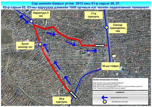 Хотын мээр баяр болох гэж байгаатай холбоотойгоор замын зохицуулатад Замын цагдаатай хамтран анхаарч байна. Улсын дугаараар нь ангилсан хотын удирдлага зарим замыг амралтын өдрүүдэд нэг урсгалтай болголоо. Тодруулбал өнөөдөр, маргааш болон 02 дугаар сарын 02,03-ны өдрүүдэд  томоохон худалдааны төвүүдийг чиглэсэн замын хөдөлгөөнд 06-20:00 цаг хүртэл түр зохицуулалт хийгдэх юм. Түр зохицуулалтаар “39 дүгээр сургуулийн уулзвараас Нарантуул-2 худалдааны төв” хүртэл авто замын хөдөлгөөнийг 1 чигийн хөдөлгөөнтэй байхаар өөрчлөлт оруулсан байна. Энэ нь  39 дүгээр сургуулийн уулзвараас Нарантуул -2 худалдааны төвийн уулзвар хооронд “урдаас-хойшоо” чиглэлээр, буцахдаа буюу “хойноос урагшаа” чиглэлдээ “Нарантуул-2” худалдааны төвийн уулзвараас далангийн замаар 32-ын тойргийн зам гээд үндсэн замналын дагуу явах юм. Энэхүү  арга хэмжээтэй холбоотойгоор  М:28 буюу  “Зам гүүрийн автобааз-Бөмбөгөр -Вокзал”; М:33 буюу “Зам гүүрийн автобааз-Ард-Зайсан”;М:36 буюу “Зам гүүрийн автобааз -3,4,хороолол-Өнөр хороолол”;М:42 буюу  “Улиастай-Сансар-Зам гүүрийн автобааз” гэсэн чиглэлүүдийн  автобусууд  дээрх маршрутаар иргэдэд үйлчилнэ. Харин бусад зах худалдааны төвүүдийн хувьд Меркури худалдааны төвийн хашаан дотор хойд хаалгаар нэвтэрч зүүн хаалга хүртэл нэг чигийн хөдөлгөөнтэй болгосон бол  Хархорин захын баруун талын гарцаар тээврийн хэрэгслийг зөвхөн оруулж,  зүүн талын гарцаар гарах юм. Мишээл экспо худалдааны төвийн хашаан доторх хөдөлгөөний зохион байгуулалтыг тойргийн системд оруулах бол   Барс худалдааны төвийн орчим Нарны гүүрний зүүн талд байрлах хоосон хашааг автомашины зогсоол болгож ар талын баруунаас зүүн чиглэлийн автобусны зогсоол дээр  нийтийн тээврийн үйлчилгээний автобус зогсоохоор  зохицуулалт хийдсэн байна.