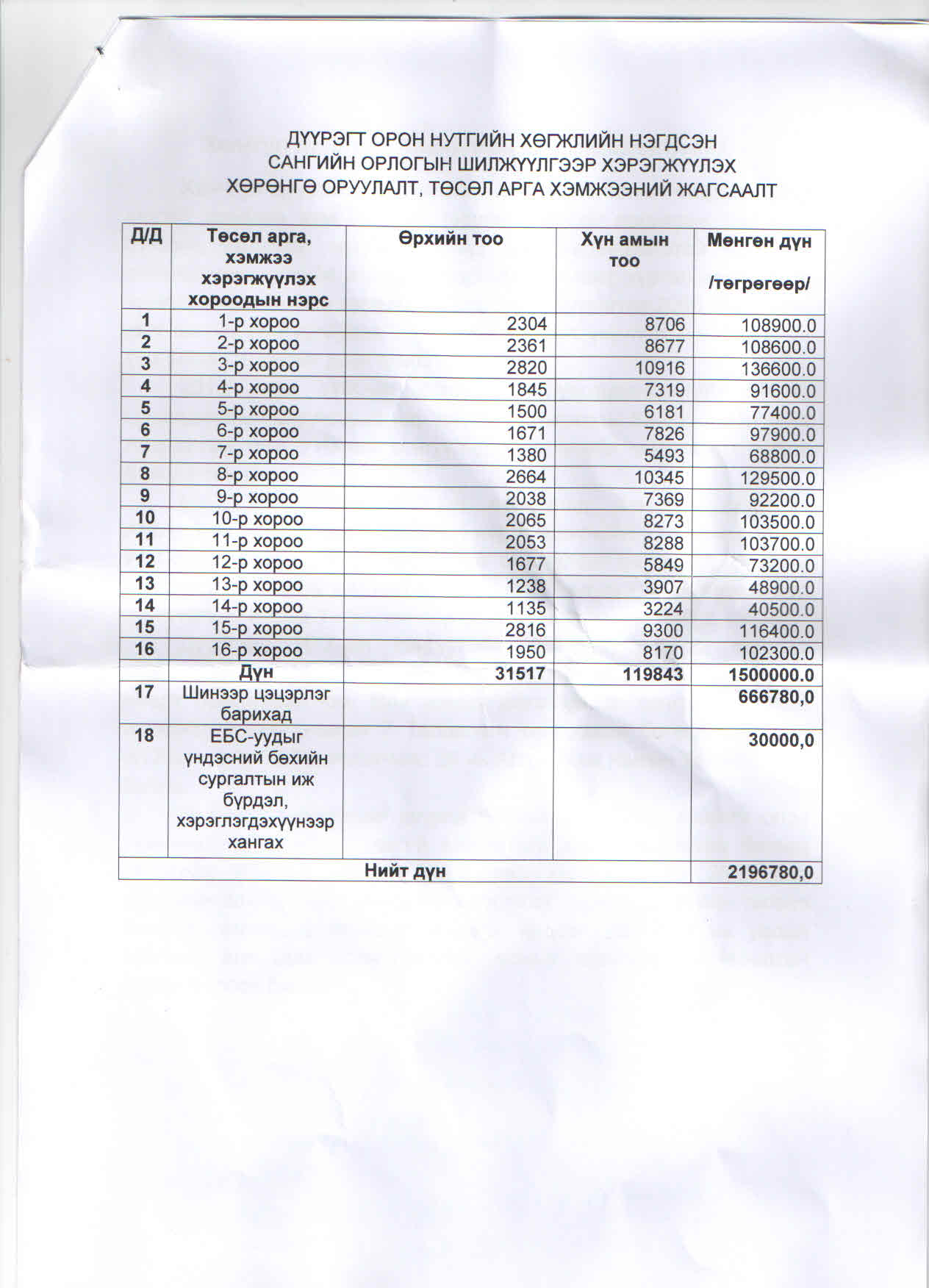 Хавсралт зураг: Хан-Уул дүүрэгт орон нутгийн хөгжлийн нэгдсэн сангийн орлогын шилжүүлгээр хэрэгжүүлэх хөрөнгө оруулалт, төсөл арга хэмжээний жагсаалт
