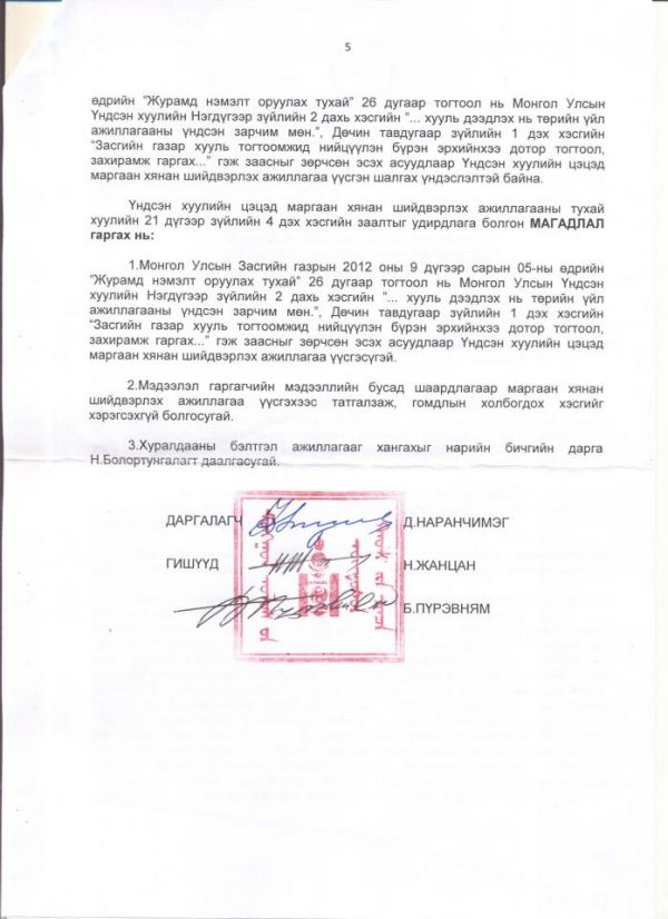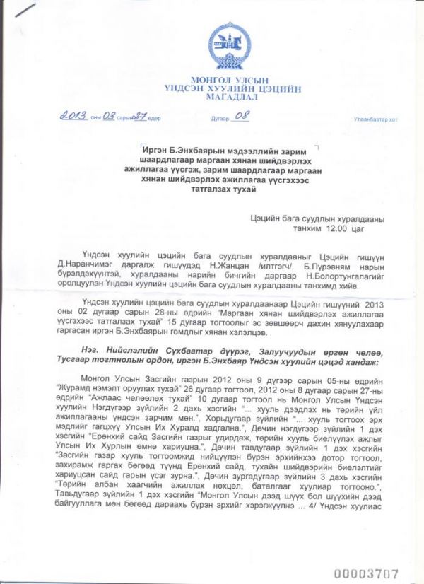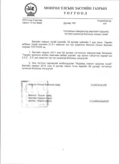 Б.ЭНХБАЯРАА ЭНЭ НИЙТЛЭЛИЙГ ЗАХИАЛГААР БЭЛДҮҮЛЭХДЭЭ ХУУЛИЙН НЭР ТОМЬЁОГ ЗӨВ ХЭЛЭХГҮЙ ДЭЭ. ГАРЧИГНААСАА ЭХЛЭЭД ДАН ХУУЛЬ БОЛОН ЛОГИКИЙН АЛДАА. ЕРӨНХИЙ САЙД ТОГТООЛ ГАРГАХГҮЙ. ЗАХИРАМЖ ГАРГАДАГ.