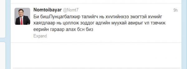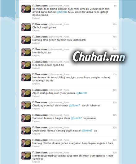 Сүүлийн үед нийгмийн сүлжээнд хүмүүс хоорондоо дайн зарладаг болж. Тэдний хэрүүл тэмцэл яг юунаас болж байгаа нь тодорхойгүй байгаа ч УИХ-ын гишүүн Н.Номтойбаяр Пунцагбалжир агсны хүү “Мон-Эрдэнэ” группын Ерөнхийлөгч Энхмөнх рүү холбоо барин “Яасан олон юм ярьдаг юм бэ. Ална шүү” хэмээн загнасан тухай өнөөдөр твиттертээ жиргэсэн байх юм. Түүнийг монголын нэртэй баяны хүү гэдгээр хүмүүс сайн мэднэ. Гэвч юуны учраас МАК-ын захирал Нямтайширын хүү, УИХ-ын гишүүн Н.Номтойбаяр “Ална шүү” гэж заналхийлэв. Твиттерээс нь харахад хүүхнээс болсон ч юм шиг.
