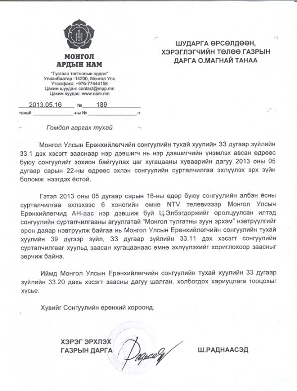 Уг нэвтрүүлгийг хэд хэдэн телевизээр орон даяар давталттайгаар нэвтрүүлж байгаа нь сонгуулийн сурталчилгааг хуульд заасан хугацаанаа өмнө эхлүүлэхийг хориглохоор заасныг зөрчиж байна хэмээн МАН-ын Хэрэг эрхлэх газраас үзэж, Монгол Улсын Ерөнхийлөгчийн сонгуулийн тухай хуулийн 33 дугаар зүйлийн 33.20 дахь хэсэгт заасны дагуу шалган, холбогдох хариуцлага тооцохыг хүсч Шударга өрсөлдөөн хэрэглэгчийн төлөө газарт ханджээ.