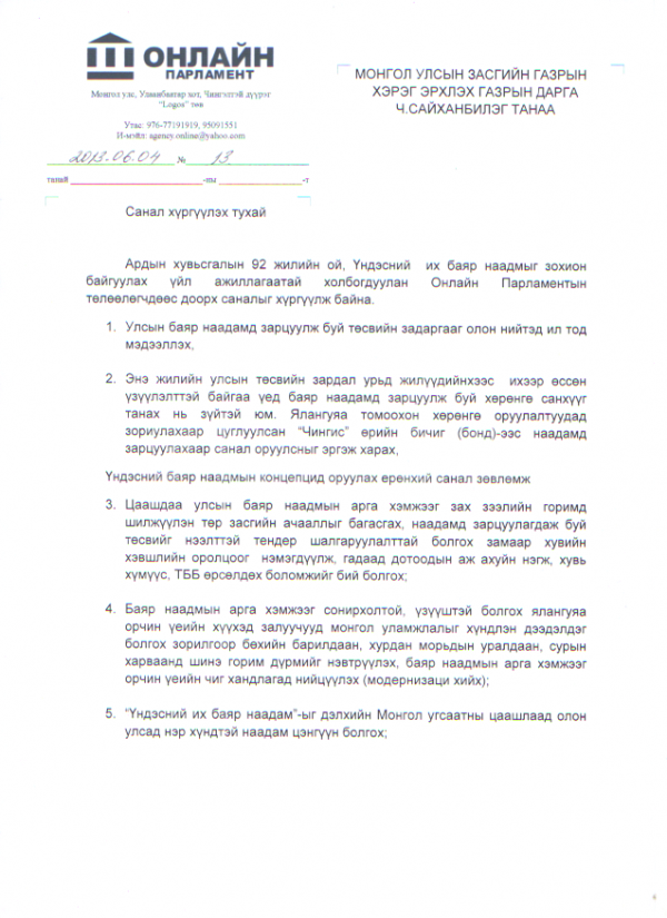 Иймээс “Онлайн парламент”-ын нэр бүхий төлөөлөлийн зүгээс МУ-ын ЗГ-т хандаж, уг зардлын задаргааг олон нийтэд ил нээлттэй болгох, зарцуулагдахаар төлөвлөсөн нэг удаагийн арга хэмжээний зардлыг бууруулах зөвлөмжийг өгч байна.