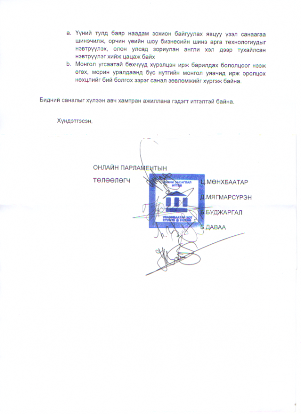 Өчигдөр буюу 6-р сарын 4-ний өдөр Онлайн парламентын төлөөлөгчид Ардын хувьсгалын 92 жилийн ой, Үндэсний их баяр наадмыг зохион байгуулах төсөв урд онуудынхаас 50 дахин нэмэгдсэн талаарх мэдээллийг хэвлэлийн бага хурлаар дамжуулан олон нийтэд мэдээллэсэн юм. Монголын эдийн засгийн үзүүлэлт буурч, төсөв танагдсан үед хэдэн тэрбумаар наадмын арга хэмжээг зохион байгуулж буйд олон нийт шүүмжлэлтэй хандаж байгааг уламжлаад хэвлэлийн бага хурлын дараа Засгийн газарт хандаж санал хүргүүлэхээ мэдэгдлээ. Энэхүү саналд Үндэсний их баяр наадмын арга хэмжээг орчин үеийн өнгө аястай шоу арга хэмжээ болгох, наадамд зарцуулагдаж буй төсвийг нээлттэй тендер зарлаж, хувийн хэвшлийн оролцоог нэмэгдүүлэх, гадаад дотоодын аж ахуй нэгж, хувь хүмүүс, ТББ өрсөлдөх боломжийг бий болгох, цар хүрээ, нэр хүндийг өсгөх талаарх саналдаа тусгажээ. Мөн энэ жилийн Үндэсний их баяр наадмын төсөв болох 40 тэрбум төгрөгийн задаргааг олон нийтэд ил тод болгох, бүтээн байгуулалтын ямар ажлууд хийгдэх талаарх мэдээллийг олон нийтэд хүргэх гэсэн асуудлууд тусгагджээ.