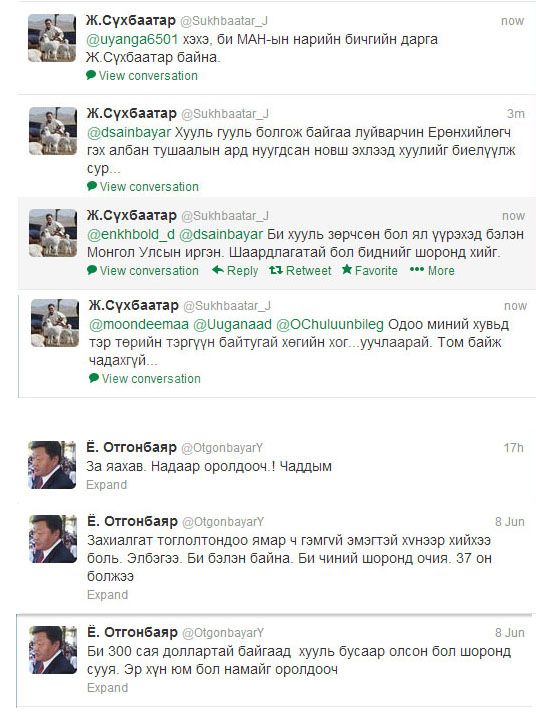 Мөн БСШУ-ны сайд асан Ё.Отгонбаяр “чаддын бол надаар оролдооч!.. Элбэгээ би бэлэн байна. Би чиний шоронд очиё... гэх мэтээр жиргэсэн нь сүүлийн үед өөрийнх тараар хэвлэлээр бичигдэж буй таагүй мэдээлэлд бухимдсан нь илт харагдаж байгаа юм. Энэ мэтээр social network сүлжээг ашиглан “шорон” гэх үгсээр чимэг хийн улс төр хийх явдал МАН-ын гишүүдийн дунд мода болон дэлгэрээд байна.
