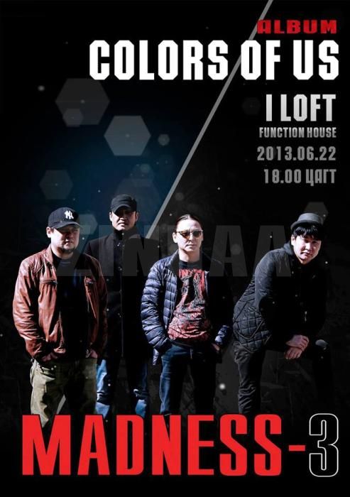 “Madness” хамтлагийнхан шинэ өнгө, шинэ дуугаралт, шинэ хэмнэлээр фенүүдээ “цэнэглэхээр” энэ сарын 22-нд Соёлын төвийн ард байрлах “ILoft Function House”-д тоглолтоо хийхээр болжээ. Энэхүү тоглолт нь тэдний бие даасан гурав дахь “Colors of Us” цомгийн өдөрлөг болон хамтлагийн 15 жилийн ойн баярын тоглолт юм байна.