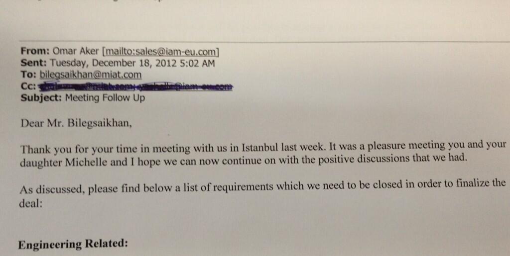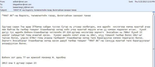 Харин С.Билэгсайханы тухайд МИАТ компанийн Бээжин дэх Төлөөлөгчийн газрын Ерөнхий менежер Н.Адилбиш гэж хүнээс 2013 оны тавдугаар сарын 23-нд өөрт нь хандаж ирүүлсэн гэх мэйл-ийг гаргаж тавьсан байгааг танд хүргэж байна. Үүнээс үзэхэд 670 кг тээшний мөнгийг АН-ынхан төлөлгүй Улаанбаатарт авчирсан нь үнэн юм байна. Түүнчлэн АН-ынхан МИАТ-ийн онгоцоор үнэгүй тээвэрлэсэн тээшнийхээ мөнгийг төлж барагдуулсан гэдэг баримтыг С.Билэгсайхан эрхэм дэлгэж харуулаагүй юм байна. Тийм баримт байхгүй юм байна гэдэг ойлголтыг авч болохоор байгаа юм.