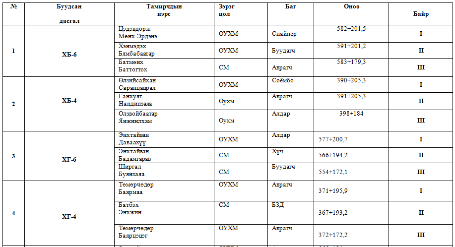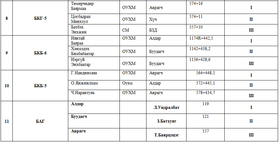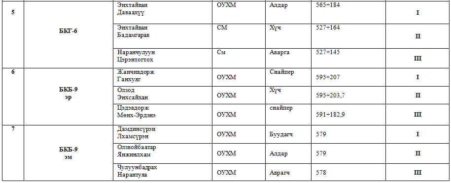 2013 оны насанд хүрэгчдийн аварга шалгаруулах буудлагын спортын тэмцээний шилдгүүдийг танилцуулъя.