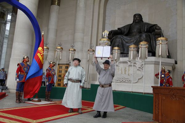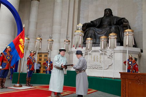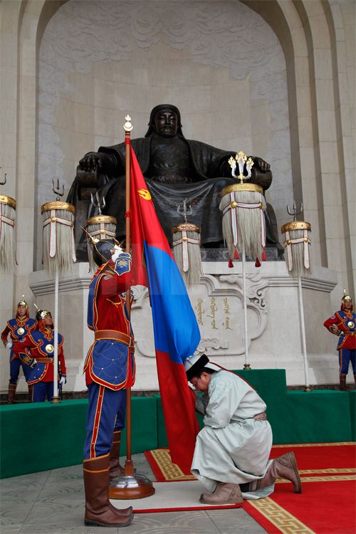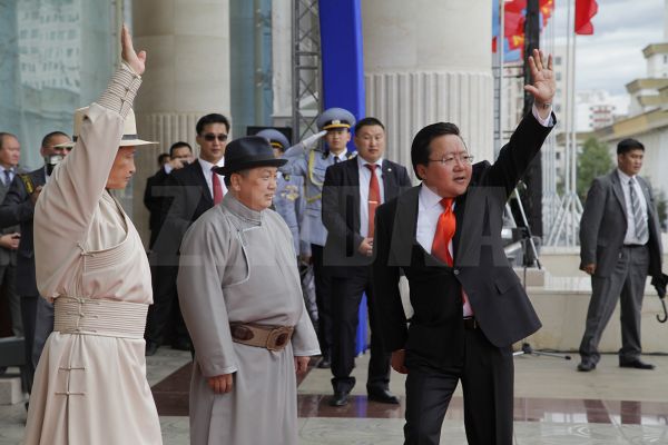 Монгол Улсын Ерөнхийлөгчийн 2013 оны сонгуулиар Төрийн тэргүүнээр дахин сонгогдсон Цахиагийн Элбэгдорж өнөөдөр 11.40 цагаас буюу морин цагт Ерөнхийлөгчийн тангараг өргөлөө. Энэ удаагийн Ерөнхийлөгчийн тангараг өргөх ёслол анх удаа Чингис хааны хөшөөний өмнө, ард иргэдийнхээ өмнө болсноороо онцлог юм. Тангараг өргөх ёслолын өмнө Төрийн есөн хөлт цагаан туг, төрийн тамга, Үндсэн хуулийн уг эх зэргийг Төрийн ордноос залан гаргаж ирлээ.