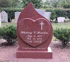 Уитни Хьюстоны шарил дээр ямар нэгэн хөшөө босгоогүй амьд цэцгийн баглаа тавьсан байсан аж. Харин саяхан алдарт дуучны шарилын хөшөөг гэр бүлийнхэн нь тусгай захиалгаар хийлгэж булшин дээр нь босгожээ. Уг хөшөөг нулимс, зүрхэн хэлбэртэй хийсэн нь хайр энэрэл болон уй гашууг илтгэж буй аж. Мөн хөшөөн дээр түүний хамгийн алдартай уран бүтээл болох “I Will Always Love You” дууны нэрийг мөнхөлсөн байна. Уитни Хьюстоны шарил Нью-Жерсигийн Уэстфильд дэх Фэйрвьюгийн оршуулгын газарт байдаг аж.