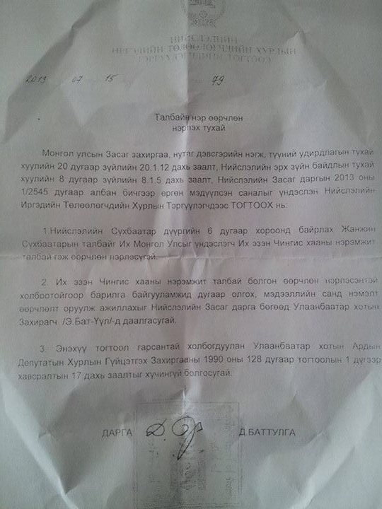 Гомдолын агуулга: Нийслэлийн ИТХ-ын Тэргүүлэгчдийн 2013 оны 07 дугаар сарын 15-ны өдрийн 79 тоот “Талбайн нэр өөрчлөн нэрлэх тухай” тогтоол гарч Нийслэлийн Сүхбаатар дүүргийн 6 дугаар хороонд байрлах Жанжин Сүхбаатарын талбайг Их Монгол Улсыг үндэслэгч Их эзэн Чингис хааны нэрэмжит талбай гэж өөрчлөн нэрлэсэн нь Монгол Улсын Үндсэн хууль, хууль тогтоомжтой нийцэхгүй буюу зөрчиж байна гэх үндэслэлээр Захиргааны хэрэг хянан шийдвэрлэх тухай хуульд заасны дагуу маргаан үүсгэж хянан шийдвэрлүүлэхээр Нийслэлийн захиргааны хэргийн шүүхэд хандсан бөгөөд түүнийг 2013-08-20-ны өдрийн 1815 тоот шүүгчийн захирамжаар хүлээн авахаас татгалзсаныг эс зөвшөөрч давж заалдах тухай,
