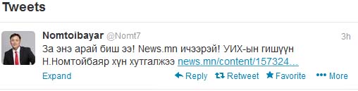 УИХ-ын гишүүн Н.Номтойбаяр хүн хутгаллаа гэсэн мэдээлэл хуурай өвсөнд тавьсан гал мэт аслаа. Түүнийг урьд шөнө Төрийн ордны ард байрлах Le Triskell хэмээх франц ресторанд бусадтай муудалцаж, хутга шөвөг дээрээ тулсан төдийгүй түүний бие хамгаалагч нь хутганд өртөж шарх авсан байна. Эл мэдээллийг эрхэм гишүүн Н.Номтойбаяр эрс үгүйсгэж "За арай биш ээ, News.mn ичээрэй" хэмээн твиттер хуудаснаа жиргэжээ.