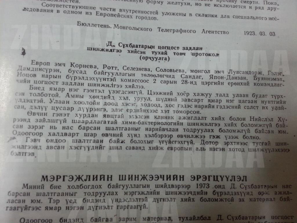 Д.Сүхбаатарын цогцост задлан хийсэн товч протокол