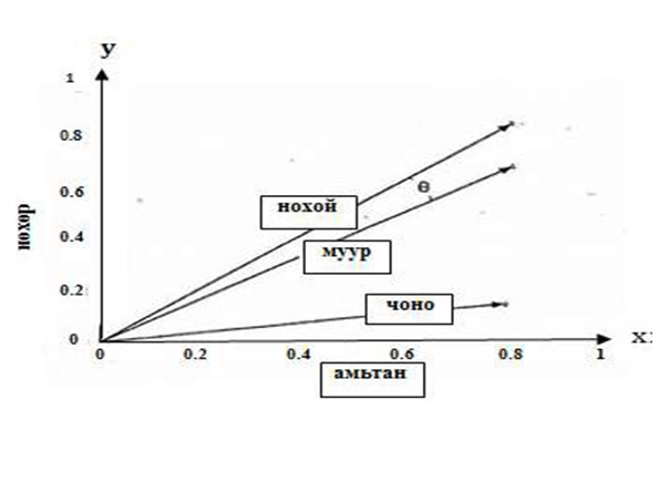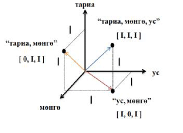 Дээрх векторын үржвэрийн зэрэгцээ хүний үгсийг холбохбайдлыг (ном авах, сонин ном, их хүч гэх мэт) резултант вектороор илэрхийлэх нь үгсийн цаадах утга, ойлголтыг, хэлний эгэл нэгжээс нийлмэл бүтцүүд үүсгэх механизмыг тодорхойлоход шинэлэг гарц руу биднийг хөтлөхөөр харагдаж байна.