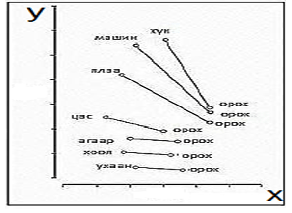 Туршилтын явцад үгсийн хоорондын семантик зайг тодорхойлсныг дараах схемүүдээр харуулъя.