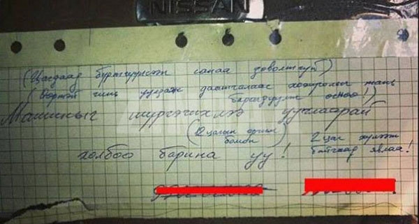 Зогсоол дээр байсан машин шүргэсэн нэгэн иргэн эзнийг нь удтал хүлээсэн ч гарч ирээгүй учир бяцхан захиа үлдээгээд явж. Ингэхдээ буруутай жолооч замын цагдаа дуудаж болсон явдлыг бүртгүүлээд, заавал уулзаж даатгалаас хохирлыг тань барагдуулахаа амласан байна.