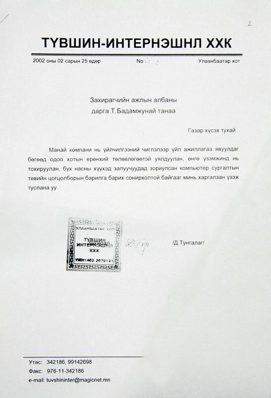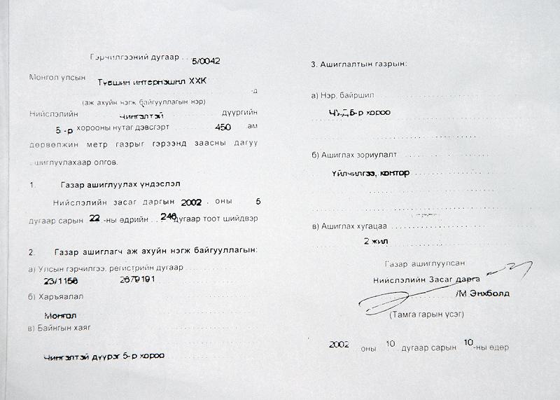 Улмаар Т.Бадамжунайд гаргасан хүсэлтийнх нь хариуг 2004 оны тавдугаар сарын 20-ны өдөр Нийслэлийн Засаг дарга М.Энхболд өгсөн байгааг доорх баримтаас харж болно. Тодруулбал, тэрбээр газар эзэмших эрхийн гэрчилгээг Чингэлтэй дүүргийн Засаг даргын 2004 оны 4 дүгээр сарын 26-ны өдрийн 185 тоот шийдвэрийг үндэслэн, нэгж талбарын 4/0126 дугаар бүхий 365 м2 газрыг 5 жилийн хугацаатай үйлдвэрлэл зориулалтаар эзэмшүүлэхээр энэхүү гэрчилгээг олгов гээд гарын үсгээ зурчихаж. Цаг хугацааны хувьд хоёр жилийн дараа газар эзэмших гэрчилгээг Түвшин-Интернэшнл ХХК авсан харагдаж байгаа юм.