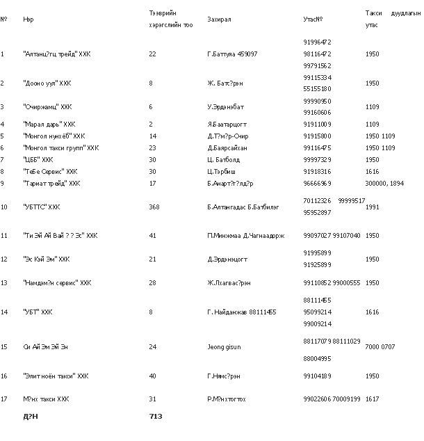 Сар шинийн өдрүүдэд  Улаанбаатар хот  дотор таксийн үйлчилгээнд 17 аж ахуйн нэгжийн 713 такси  ажиллаж, дуудлагаар үйлчлэх аж.