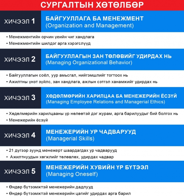 2010 оноос эхлэн хичээллэсэн энэхүү сургалт урьд нь 7 удаа зохион байгуулагдсан бөгөөд нийт 380 гаруй төгсөгчийг бэлтгэн гаргасан бөгөөд Монголын Шилдэг компани, аж ахуйн нэгжүүдийн удирдлагагууд сургалтуудыг удирдан явуулдагаараа онцлогтой сургалт юм.