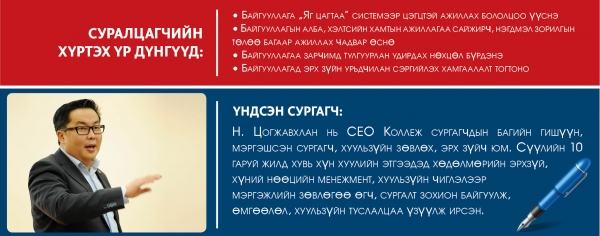 Сүүлийн үед бизнесийн сургалтууд зөвхөн захиралд эсвэл ажилтанд чиглэн зохион байгуулагдаж байгаа бол энэхүү сургалтын онцлог нь удирдах ажилтан манлайлан, хичээл бүрт тухайн ажлыг эрхэлж байгаа ажилтан, албан тушаалтнаа дагуулан ирж хамтдаа суралцах боломжтой.