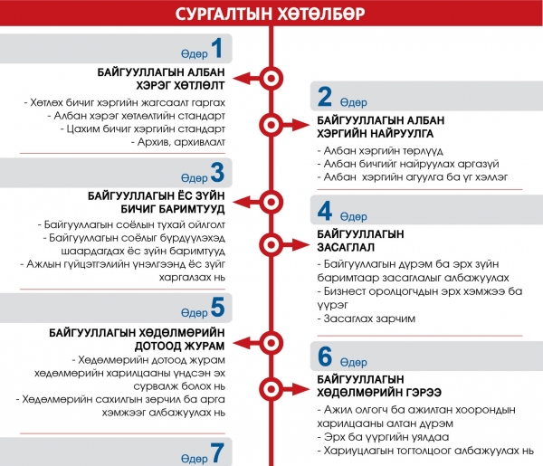 Жишээлбэл: Албан хэрэг хөтлөлтийн хичээлд Захирал + Бичиг хэргийн ажилтаны хамт, Хөдөлмөрийн эрх зүйн хичээлд Захирал+ Хүний нөөцийн ажилтны хамт, Байгууллагын санхүүгийн бичиг баримт хичээлд Захирал+ Санхүү, нягтлан бодогчийн хамт гэх мэтчилэн өдөр бүрийн хичээл өөр өөр байдлаар зохион байгуулагдана./ Энэ нь эдийн засгийн хувьд өгөөжтэй, нөгөө талаасаа байгууллагын дотоод хамтын ажиллагаа сайжирч, ажлын бүтээмж дээшилж , үр дүнд чиглэн зарчимд тулгуурлан удирдах боломжийг олгох юм.