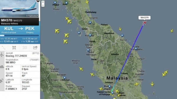 Тайланд бичсэнээр, онгоц чиглэлээсээ хазайж Малаккын хоолойд хүрсэн байна. Онгоц Куала Ломпурын олон улсын нисэх буудлаас хөөрснөөс нэг цагийн дараа радараас алга болсон. Хөөрснөөсөө хойш Хятадын өмнөд тэнгис, Вьетнамын Ка Мау хойгийн дээгүүр ниссэн аж.