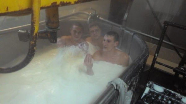 Оросын бяслагны үйлдвэрийн ажилчид сүүндээ шумбаж байгаа зураг цахим хуудсаар тарж олон хүний дургүйцлыг хүргэжээ. Тэд таны харж байгаачлан сүүтэй онгоцонд усанд орохоос наахнуур хагас нүцган шумбасан зургаа дэлгэсэн байжээ.
