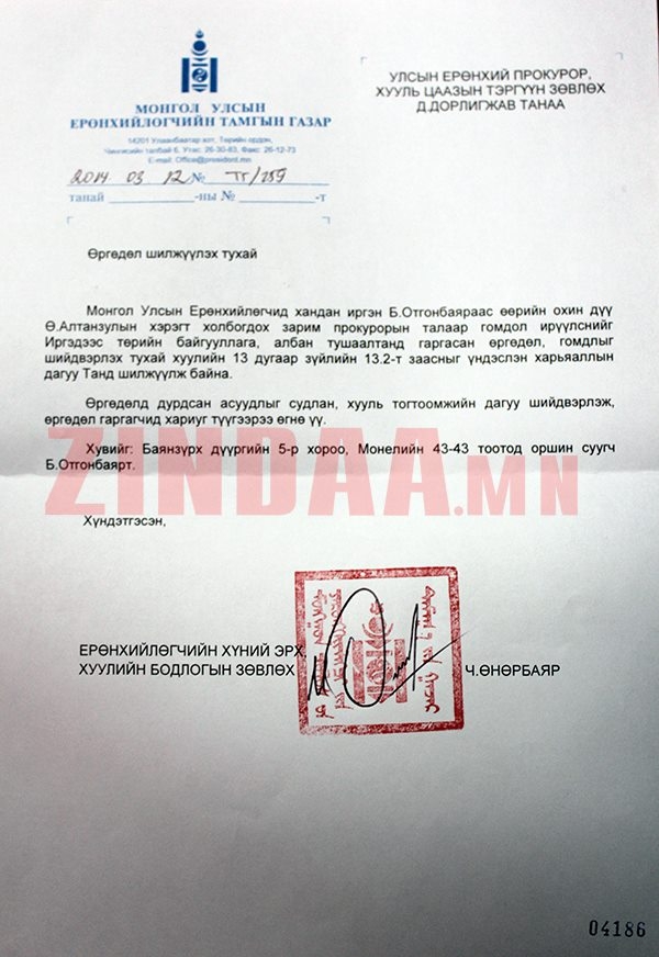 -Энэ хэргийг үнэн зөвөөр шийдүүлж өгөөч хэмээн Монгол Улсын Ерөнхийлөгчид захидал бичсэн гэсэн. Энэ талаар?