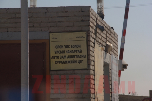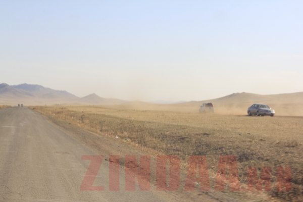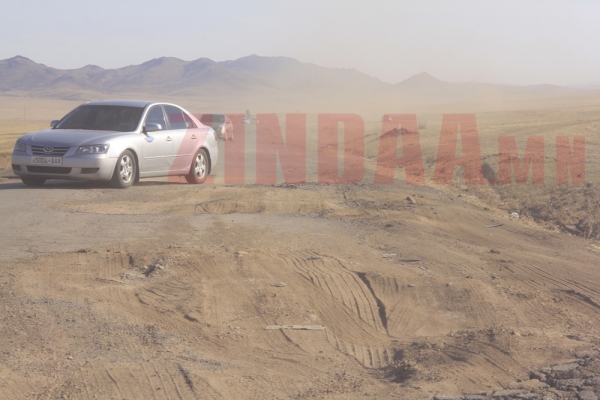 "Олон улсын чанартай авто зам" хэмээн нэрлэсэн дээрх постоор орж гарах тутамдаа зам ашигласны хураамж 1000 төгрөг төлнө. Харамсалтай нь энэ мөнгө хаашаа урсдаг нь ойлгомжгүй байсаар удсан. Улсаас төсөв баталж олон жил сараар тендерийн дагуул болон байж хот хоорондын зам тавих засах ажил хийгддэг ч бодит байдал дээр иймэрхүү байгааг уншигч та зургаас харж байгаа байх.Ийм өм цөм болсон замаар явж машинаа эвдэх, цаашлаад осол аваарт орохыг хэнч хүсэхгүй. Тиймээс цөмөрсөн гурван км газарт жолооч нар зүлэгээр явж хэн бүхэн дуртай газраараа шороо татуулан зам гаргаж байгааг "чанртай замын алба"-ныханд дуулгах нь зүтйэ бизээ.