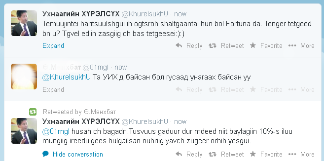 Khurelsukh ard tumnii tuluu yavaj chadah jinhene er hun dee. Ortoi yum bichsen bna, gants batbayar gevel denduu buruu, hoich ue urund unaj baigaag Batbayar hiigeed baigaa gevel enduu shuu. Bugd l hiij baigaa shuu dee, Khurelsukh mini hurdan irj alaltsaach. Yagaad amia bodood suraad bgaa yum chi. Naad angli hel, ene ter chini MGL-g hugjuulehgui ee, ekh oronch uzel, ediin zasgiin uhaan, hun chanar hugjuulne. Demii surch baihaar