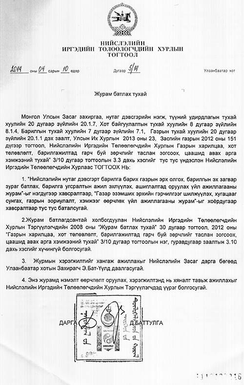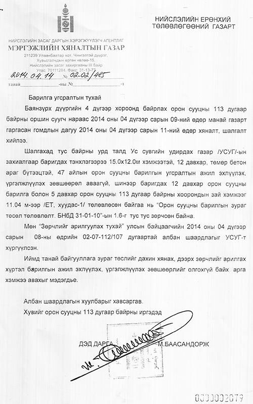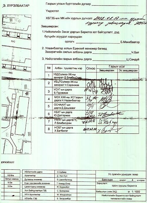 Хүн ам нь сая хол давсан нийслэлчүүдийн асуудал замын түгжрээ, сөөм зайтай шаван баригдах барилга болоод байна. Шинээр баригдаж байгаа нь үйл ажиллагааны авулгүй байдлыг бүрэн хангаагүйгээс болж хүний аминд хүрэх, баригдсан нь оршин суугчдын тав тухыг алдагдуулахаас эхлээд асуудал олон. Хотын даргын улс төрийн пиар нь барилга байсныг уншигч та санаж байгаа байх. Тэрбээр барилгын үнийг буулгана, зөвшөөрөлгүй барилгыг нураана гэж телевизээр өдөр алгасалгүй ярьдаг байлаа. Харамсалтай нь бодит байдал дээр биелсэн зүйл үгүй. Танд одоо хүргэх гэж буй мэдээлэл үүнтэй холбоотой маргаан. Тодруулбал Ус Сувгийн Удирдах газар болоод иргэдийн хооронд үүссэн ширүүн тэмцэл юм. Харин үүний гол зангилаа нь төрийн байгууллагууд болж таарсан. Улаанбаатар хотын захирагч бөгөөд Нийслэлийн засаг дарга УСУГ-т Баянзүрх дүүргийн дөрөвдүгээр хороо, 113 дугаар байрнаас 7.6 метрт 12 давхар барилга барихыг аман байдлаар зөвшөөрсөн байдаг. Уг газрын зөвшөөрлийг өмнөх хотын дарга 2012 онд өгсөн нь ийнхүү асуудал үүсэх шалтгаан болсон байна. Ингээд нар хаахаас гадна иргэдийн аюулгүй байдалд илтэд заналхийлсэн өндөр барилгыг бариуулахгүй байхаар тус байрны оршин суугчид МХЕГ-т хандахад энэ сарын 14-ний өдөр МХЕГ-ын дэд дарга Баасандорж зөвшөөрлийг цуцлах тухай албан шаардлага хүргүүлсэн байна. Харин үүнээс ердөө 9 хоногийн дараа Нийслэлийн Ерөнхий төлөвлөгөөний газраас Барилгын ажлыг эхлүүлэх, үргэлжлүүлэх зөвшөөрлийг Б.Эрдэнэтуяа гэгч дур мэдэн өгсөн байдаг. Уг зөвшөөрөгдөөгүй барилга нь 12 давхар болон сүндэрлэх бөгөөд УСУГ-ын ажилчдын орон сууцны зориулалттай гэдгийг ч эх сурвалжууд баталж байгаа. Харин монгол улсын шинээр мөрдөгдөж байгаа хууль тогтоомжинд уг барилгын хэмжээ 45 метрийн зайд байна гэж тод тусгасан байна. Харамсалтай бодит байдал дээр ердөө 7,6 метрт буюу 113 дугаар байрны цонхон дор хамар шүргэх зайтай барилгын ажил эхэлж газраа ухаад эхэлсэн байгаа. Оршин суугчдын хамгийн ихээр санаа зовж байгаа зүйл бол тус байрны шугам сүлжээг ухаж төнгөчөөд байгаа нь асуудлыг хүндрүүлж болзошгүй гэж үзэж байгаа аж.