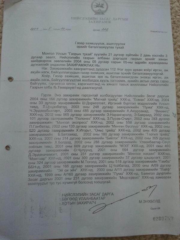 Энэ хуурамч буюу эвлүүлж хийсэн захирамж байна. М.Энхболд дарга 2004-2008 онд УИХ-ын гишүүн, байсан, бас ерөнхий сайд байсан хүн. Хүн гүтгэх хориотой бөгөөд шүүхээр яллагдаж ч болно.