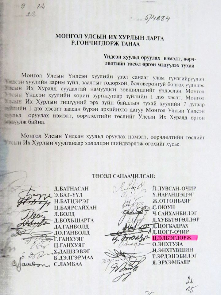 1999 оны арванхоёрдугаар сарын 23 буюу УИХ-ын Намрын чуулганаар нэр бүхий гишүүд Үндсэн хуульд өөрчлөлт оруулах хуулийн төслийг өргөн барьж байсан. Өнөөдөр сав л хийвэл эцэг хуулийг завхруулсан долоон өөрчлөлт гэж ирээд тухайн үеийн МСДН, МҮАН, МАХН-ны гишүүн байгсдыг ичээдэг явдлын нэг хэсэг гэсэн үг.
