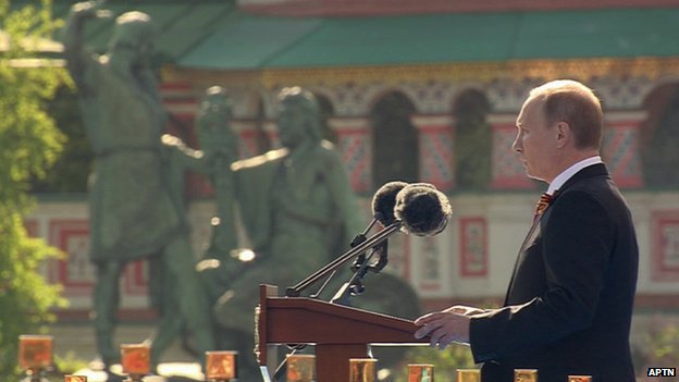 Путин энэ үеэр “ЗХУ-ын ард түмний төмөр хүсэл тэднийг Европын дарлалд өгөөгүй. Энэ ялалтыг аугаа их эх оронч үзэл авчирсан юм. Эх оронч үзлийг бид эх нутгийн газар шороо аюулд орсон үед, ашиг сонирхол зөрчигдөөд эхлэхээр гойд мэдэрдэг” гэжээ. Украйнд өнөөдөр өндөржүүлсэн бэлэн байдал зарласан ба про-оросууд энэ өдөр чангарч магад гэж болгоомжилж байгаа аж.