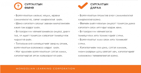 Хэрэглэгчид ямар бүтээгдэхүүн үйлчилгээг хүсэмжилж буй илрүүлэх, зөв мэдээллийг цуглуулж, зөв хүнд нь зөв цагт нь зөв бараа бүтээгдэхүүнийг хүргэх ажлыг гүйцэтгэх борлуулалтын ажилтанаа сургахгүйгээр даяаршиж буй бизнесийн орчинд өрсөлдөөнд оролцох тийм амар биш биз иймээс захирал танд борлуулалт, түгээлтийн ажилтанууд, борлуулалтын менежерүүдэд зориулсан МАСТЕР БОРЛУУЛАГЧ сургалтыг санал болгож байна.