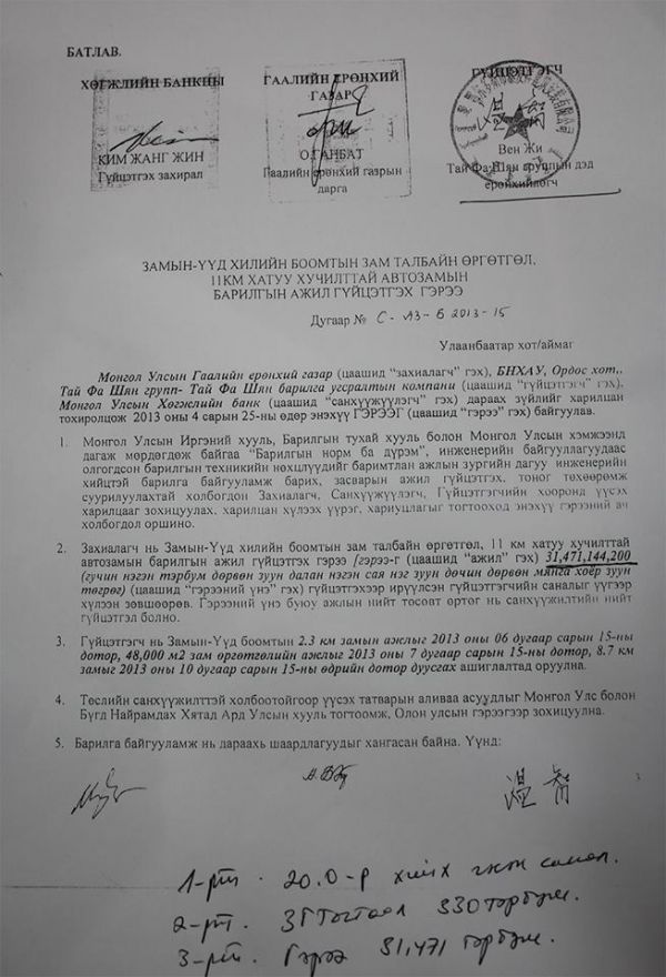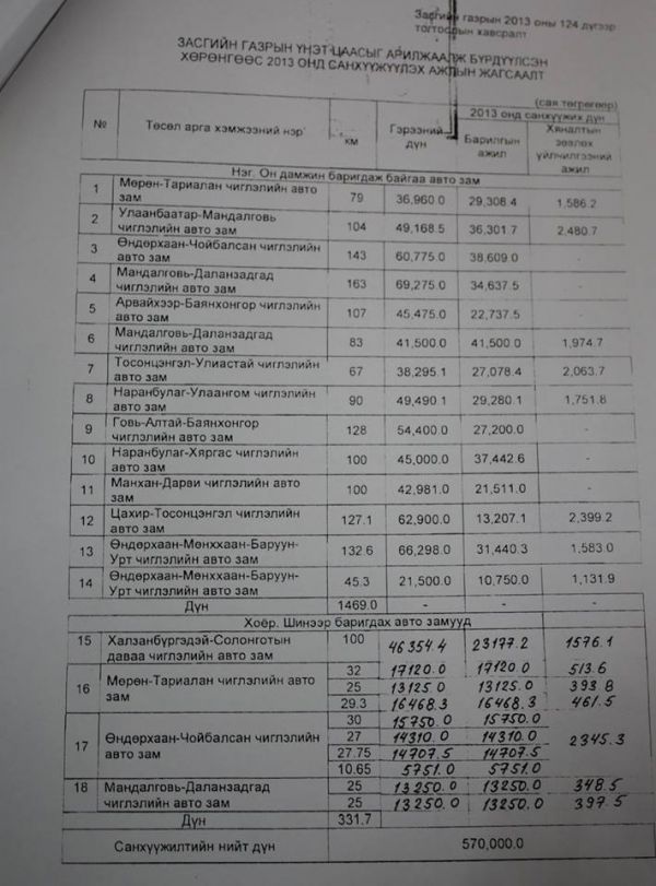 -Солонготын даваа-Халзанбүргэдэйн 100 км замыг 19.4 тэрбум төгрөгөөр хийж гүйцэтгэхээр Өвөрмонголын нэгэн компани гэрээ байгуулан ажилласан байдаг. Гэтэл эдийн засгийн хүндрэлээс болоод ажил 30 гаруй хувьтай зогссон байдаг. Ахиад тус замыг барихаар 2013 төсөвт суутгахдаа 37.2 тэрбум төгрөгөөр ажлыг нь гүйцэтгэх тогтоол гарсан байдаг. Төсөвт суутгасан мөнгөөр нь “Монроуд” ХХК гүйцэтгэхээр ажлаа эхэлсэн байдаг. Гэтэл долоо хоногийн дараа төсөвт өртөг 46 тэрбум болж өссөн байна. Яагаад гэхээр Эдийн засгийн хөгжлийн сайд Н.Батбаярын гарын үсэгтэй ЗГ-ын 124 дүгээр тогтоол дээр Солонготын даваа-Халзанбүргэдэйн 100 км зам бүтэнээрээ орж ирсэн байдаг. Өмнө нь Өвөрмонголын компани 30 гаруй хувьтай замаа тавьчихсан байсан.Энэ зам гэхэд 9 тэрбум илүү төсөвлөсөн байна.Ингээд энэ хоёр зам дээр дутсан 20 тэрбум төгрөгний асуудал дээр Эдийн засгийн хөгжлийн сайд Н.Батбаярын оролцлоо байгаа гэж үзэж байгаа. Мөн цаашлах юм бол Ерөнхий сайд Н.Алтанхуяг хүртэл оролцсон байж болзошгүй.