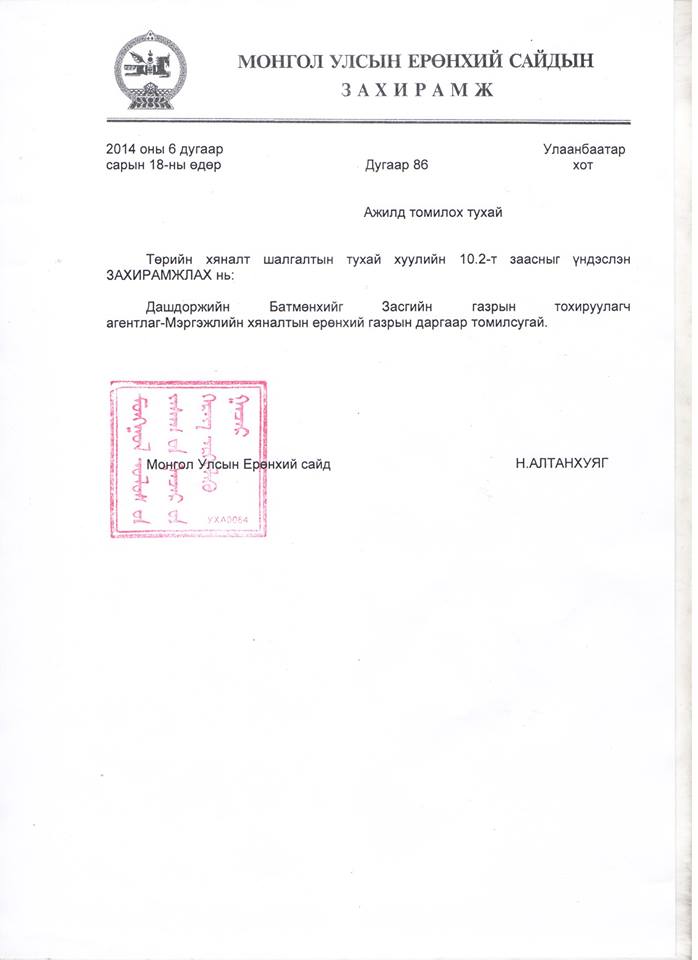 Төрийн хяналт шалгалтын тухай хуулийг үндэслэн Монгол Улсын Ерөнхий сайд Н.Алтанхуяг зургаадугаар сарын 18-ны өдөр захирамж гаргаж Засгийн газрын Тохируулагч агентлаг - Мэргэжлийн хяналтын ерөнхий газрын даргаар Д.Батмөнхийг жинхлэн томиллоо.