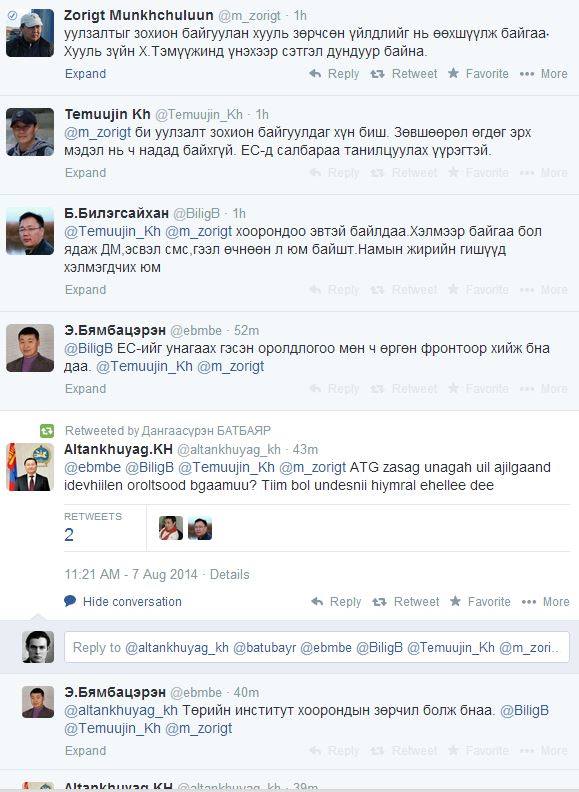 Altankhuyag Kh gj uur hun shuu dee. Twitteriin alban esnii mun uu bishuu gedgiig n sain har.. Д.Буянбат та энэ мэдээлэлээ устгах хэрэгтэй, аль эсвэл мэдээлээ өөрчил. Энэ мэт албан бус мэдээлэл дамжуулсанаас болж сэтгүүлчидийн нэр хүндийг улам унагаж байна