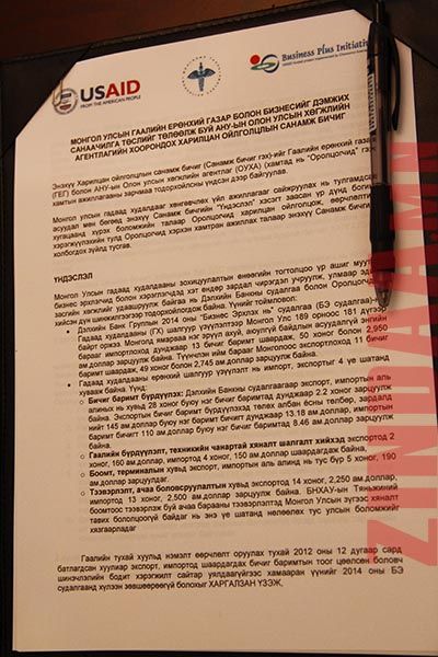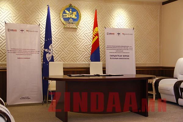 Монгол Улсын Гаалийн ерөнхий газар болон АНУ-ын Олон улсын хөгжлийн агентлагийн хоорондох Харилцан ойлголцлын санамж бичиг байгууллаа. Гаалийн ерөнхий газрыг төлөөлж дарга О.Ганбат болон Монгол Улс дахь АНУ-ын Олон улсын хөгжлийн агентлагийг төлөөлж суурин төлөөлөгчийн үүрэг гүйцэтгэгч Ричард Х.Чен нар 2014 оны 8 дугаар сарын 27-ны өдөр Гаалийн ерөнхий газарт гарын үсэг зурлаа. Энэхүү Санамж бичиг нь Монгол Улсын гадаад худалдааг хөнгөвчлөх талаарх талуудын хамтран ажиллах сонирхолыг илэрхийлж байгаа юм. Тус Санамж бичигт дурдсан үйл ажиллагааг талууд хамтран хэрэгжүүлсний үр дүнд Гаалийн ерөнхий газар нь худалдаа эрхлэгчдэд учирч буй дарамтыг багасгах, бүрдүүлэлтийн дараах шалгалт хийх, эрсдлийн удирдлагыг хэрэгжүүлэх, мэдээллийн технологийг түлхүү ашиглах боломжтой болно. Түүнчлэн Гаалийн ерөнхий газар болон АНУ-ын Олон улсын хөгжлийн агентлаг нь Бизнесийг дэмжих санаачилга төслөөр дамжуулан Монгол Улсад гадаад худалдааг хөнгөвчлөхийн тулд энэ чиглэлээр шинэчлэлийн бүхий л процесст хувийн хэвшлийн оролцоог дэмжих зорилгоор төр хувийн хэвшлийн харилцан яриаг зохион байгуулна. Энэхүү хамтын ажиллагааны хүрээнд АНУ-ын Олон улсын хөгжлийн агентлагийн санхүүжилттэй Бизнесийг дэмжих санаачилга төсөл нь • Гаалийн байгууллагын үйл ажиллагааг илүү үр дүнтэй, • ил тод болгох, • гаалийн бүрдүүлэлтийн явцад худалдаа эрхлэгчдээс зарцуулдаг цаг хугацаа, зардлыг хэмнэх зорилгоор гаалийн үнийн мэдээллийн модулийг нэвтрүүлэх, • гаалийн цахим төлбөр тооцооны системийг хэрэгжүүлэх, шинээр нэвтрүүлсэн эрсдэлийн удирдлагын системийн тогтвортой үйл ажиллагааг хангах, • Гаалийн ерөнхий газрын Бүрдүүлэлтийн дараах шалгалтын газар, Эрсдэлийн удирдлагын хэлтэс, Мэдээллийн технологийн төвд техник туслалцаа үзүүлэх, боловсон хүчнийг нь мэргэшүүлэх сургалт зохион байгуулах зэрэг дэмжлэгийг Гаалийн ерөнхий газарт үзүүлнэ. Энэхүү Санамж бичиг нь гаалийн тухай хуулийг шинэчлэн найруулах, олон улсын техникийн туслалцаа үзүүлэх, Гаалийн байгууллагаас худалдааг хөнгөвчлөх талаар хэрэгжүүлж буй шинэчлэлийг урагшлуулахтай холбоотой дотоодын чадавхийг бэхжүүлэх зэрэг өргөн хүрээнд Гаалийн ерөнхий газартай өрнүүлж буй хамтын ажиллагааны нэг хэсэг болон байгууллагдаж байна. 0J8A1370