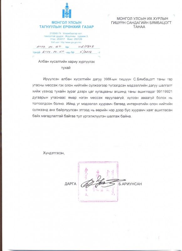 МАН-ын бүлгийн дарга С.Бямбацогтын утаснаас бусад руу мессеж бичсэн тухай мэдээлэл цахим ертөнцөд тараад байсан. Тэрбээр өөрөө мессеж бичээгүй гэдгээ мэдэгдээд ТЕГ-т хандаад байсан юм. Тэгвэл УИХ-ын гишүүн С.Бямбацогтын энэ хүсэлтийн дагуу ТЕГ-аас шалгалт хийхэд тухайн зураг дээрх цаг хугацааны үед түүний утаснаас ямар нэгэн мессеж явуулаагүй, хүлээн аваагүй болох нь тогтоогдсон байна. Иймд уг хуурамч мэдээллийг олон нийтийн сүлжээнд анх байрлуулсан этгээд өөрийн нэр дээр бус хуурамч хаяг ашиглсан байх магадлалтай тул хэргийг үргэлжлүүлсэн шалгаж байгааг ТЕГ-аас мэдэгдлээ.