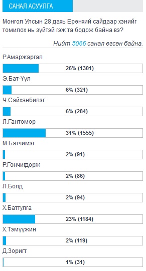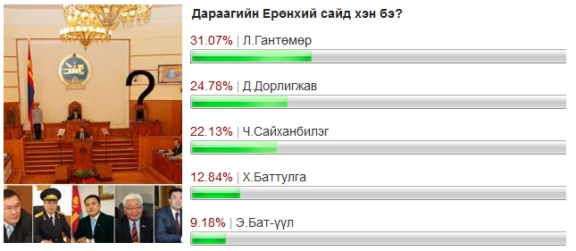 Шинэ Ерөнхий сайд хэн болох вэ гэдэг өнөөдөр хамгийн гол сэдэв, чухал асуудал болоод байна. Мэдээ, мэдээллийн сайтууд Монголын интернэт хэрэглэгчдийн дунд энэ талаар санал асуулга явуулж эхэллээ. Олон уншигчтай news.mn, zindaa.mn gogo.mn, chuhal.mn зэрэг сайтуудын санал асуулгыг Боловсролын сайд Л.Гантөмөр тэргүүлж байна.