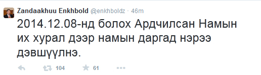 Ерөнхий сайдыг огцруулах асуудал яригдаж эхлэхээс дараагийн Ерөнхий сайд хэн байж болох талаар хэвлэлүүд таамаг дэвшүүлж эхэлсэн. Эдгээр таамгийн эхэнд нэр нь бичигдэж байсан хүн бол УИХ-ын дарга З.Энхболд. Гэсэн ч тэрээр Ерөнхий сайдад нэр дэвшихгүй гэдгээ мэдэгдэж байлаа. Тэгвэл УИХ-ын даргын сонирхол намын дарга болох байсан бололтой. Тэрээр “2014.12.08-нд болох Ардчилсан Намын их хурал дээр намын даргад нэрээ дэвшүүлнэ” гэж твитер хуудаснаа жиргэжээ.
