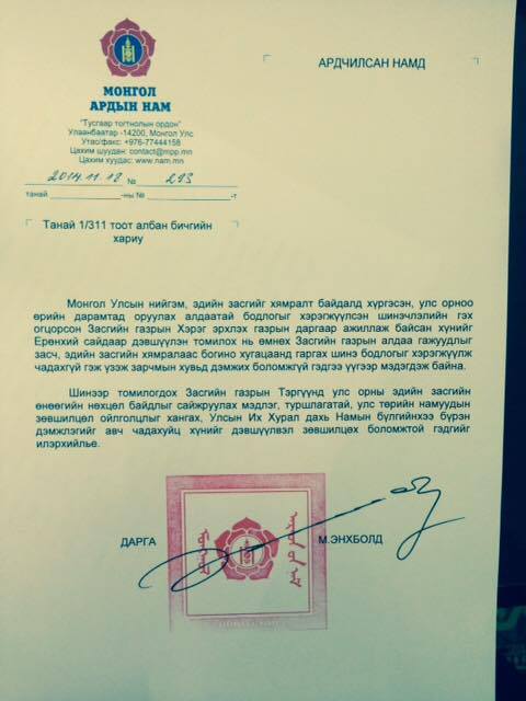 Өнөөдөр МАН-ын зүгээс Ерөнхий сайдад нэр дэвшсэн Ч.Сайханбилэгийг дэмжихгүй гэдгээ илэрхийлсэн. АН-ын ирүүлсэн саналын хариуд дараах албан бичгийг хүргүүлжээ. Үүнд,