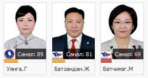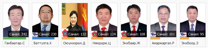 Улс орон, ард иргэддээ хэрэгцээтэй ямар хууль дүрэм санаачлан батлуулж, ямар тогтоол шийдвэр гаргахад хувь нэмэр оруулж байна вэ? Таны сонгосон төрийн түшээ хариуцлагатай байж чадаж байна уу гэдэгт уншигчид, сонгогчид, ард түмэн та бүхэн үнэлэлт дүгнэлт өгөх эрхтэй билээ. Одоогийн байдлаар хамгийн хариуцлагатай улс төрчдийн жагсаалтыг С.Ганбаатар гишүүн 242 саналтайгаар тэргүүлж байгаа бол Х.Баттулга 230, Д.Оюунхорол 132 санал, Ц.Нямдорж 124 саналтай байна. Харин Ж.Энхбаяр 108 , Р.Амаржаргал 101, З.Энхболд 95, Г.Уянга 89, Ж.Батзандан 81, М.Батчимэг 69 санал авч, бусад гишүүдээ хошуучилж байна.