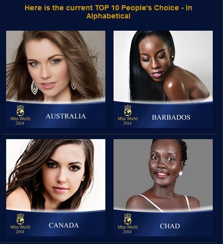 “Дэлхийн мисс-2014″ тэмцээнд эх орноо төлөөлөн мисс Т.Батцэцэг орлоцож явна. Тэрээр хэд хоногийн өмнө “Top model” шалгаруулалтад шилдэг 20-д багтсан бөгөөд мөн “Choice award” буюу дэмжигчдийн санал асуулгын тоогоор тодруулдаг шалгаруулалтад хоёрдугаарт жагссан амжилттай явав. Гэтэл “Miss World Mongolia-2014” тэмцээний ялагч, Азийн топ модель Т.Батцэцэг тэмцээн дуусах өдөр буюу өнөөдрийн байдлаар “Choice award” төрөлд эхний арваас мултарсан байна.Спорт, авьяас, үндэсний хувцас, хүмүүнлэгийн үйл ажиллагаа, дэмжигчдийн сонголт, бикини, топ модель зэрэг тэмцээнүүдэд ялсан ялагчид шууд “Дэлхийн Мисс”-ийн финальд үлдэх эрхтэй болдог. Ийм учраас “Choice award” бол Т.Батцэцэгийн хувьд том боломж билээОдоогийн байдлаар дэмжигчдийн санал асуулгаар эхний аравт яваа оролцогчдыг үсгийн дарааллаар нэлэвэл Австрали, Барбадос, Канад, Чад, Гаити, Энэтхэг, Непал, Филиппин, Танзани, Тайландын миссүүд нэрлэгджээ.