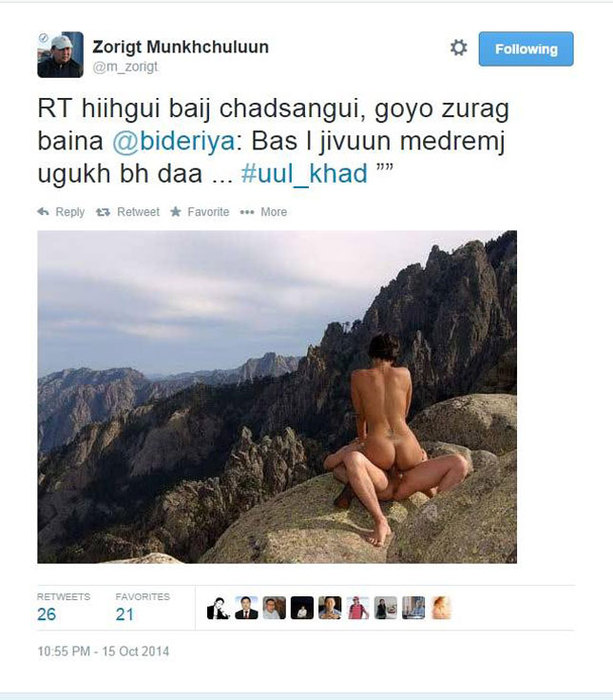 УИХ-ын гишүүн М.Зоригт оны хамгийн секси жиргээчээр нэрлэгдэж байгаа. Түүний энэ жиргээ сошиал ертөнцөөр чамгүй дуулиан тарьж, эзэндээ дээрх нэрийг хайрласан билээ. Түүнчлэн тэрээр нэгэн бүсгүйн нүцгэн зургийг оруулаад “нутгийн бүсгүй” гэх мэтээр нүцгэн шалдан зурагт дуртайгаа илчилсэн байдаг.