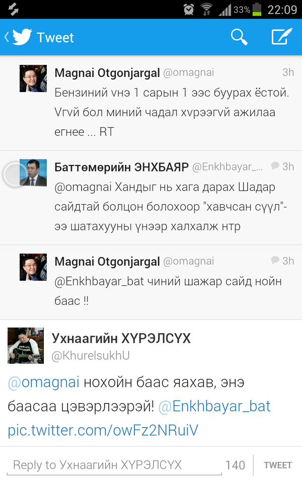 Шударга өрсөлдөөн, хэрэглэгчийн төлөө газрын дарга О.Магнай шинэ оны босгон өөрийн "Twitter" хуудсаараа дамжуулан нэгэн жиргээ чулуудсан нь олныг оволзуулав. Гэвч тэрээр тун удалгүй өнөөх жиргээгээ устгажээ. Тус жиргээнээс үүдэн нэг хэсэг нь түүнийг аргагүй байдалд орсон тул аргаа бодож байна, тийм ч цэвэр ажиллаагүй гэж байгаа бол нөгөө хэсэг нь У.Хүрэлсүх ажил хийж байгаа хүнийг дарамталлаа хэмээн өмөөрч байна.