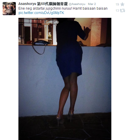 Мэргэжлий сумо бөхийн их аварга Асашёрюү Д.Дагвадорж өөрийн твиттер хуудаснаа нэгэн бүсгүйн ар нуруунаас харсан зургийг оруулан “Энэ нэг алдартай жүжигчний нуруу, хамт байсаан байсан” Таалдаа та нарын сайн танил бүсгүй... хэмээн жиргэсэн нь жиргээчдийн дунд дуулиан тарьсан жиргээний нэг болов. Харин хэн ч тэр бүсгүйн нэрийг тааж чадаагүй.