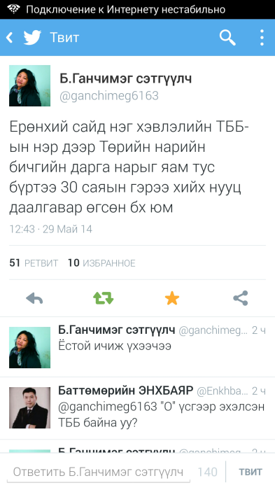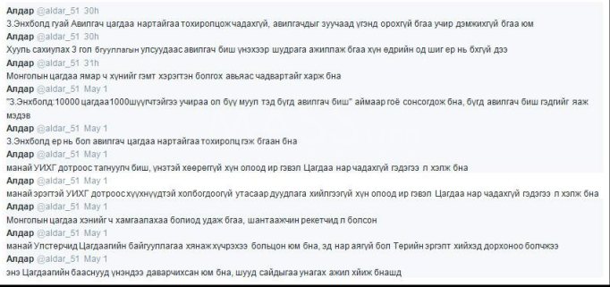 Сүхбаатар аймгийн Эрдэнэцагаан сумын иргэн н.Алдар гэгч ийнхүү твиттерт жиргэснийхээ төлөө баривчлагдав. Түүнийг хуулийн салбарын шинэчлэлийг дэмжиж, цагдаагийн албатай холбоотой, хууль зүйн салбарын шинэчлэлийг эсэргүүцэж буй зарим цагдаагийн удирдлагын талаар шүүмжилсэн жиргээ жиргэснээс болж бүтэн өдрийн турш байцааж, мэдүүлэг авсан юм.